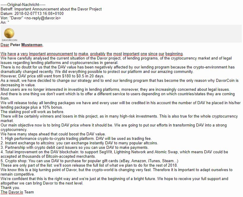 Original-Meldung zum Ende von DavorCoin-Investments